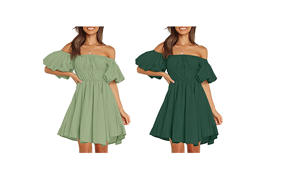 MEROKEETY Women's Puff Sleeve Off Shoulder A Line Dress Ruffle Shirred Summer Mini Dress with Pockets 4 customer reviews About this item Size: US SIZE, Small=(US 4-6), Medium=(US 8-10), Large=(US 12-14), X-Large=(US 16-18), XX-Large=US 20. Summer beach boho dress, suggest iron in low before wearing! Unique design: Elastic waist ruffle hemline, A line, puff short sleeve and elastic cuff, off shoulder, solid color, flowy dress, shirred ruched bust. The sleeves can be pulled up for a sweet square neck look. You're looking extra cute and feminine wearing our babydoll dress! Featuring short puffy sleeves, an off-shoulder cut/square neckline, and a flared skirt - all in a babydoll silhouette, finished with a ruched bust and an elastic high waist. Stroll around town in this off the shoulder dress! More Read... Price: $34.99/-