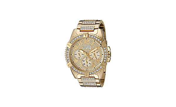 Guess 48MM Crystal Embellished Watch 4 customer reviews About this item GOLD-TONE CRYSTAL CHRONO-LOOK DIAL Features: DAY, DATE plus 24 HOUR MILITARY/INT'L TIME FUNCTIONS 46 MM CASE SIZE with DURABLE MINERAL CRYSTAL that protects watch from scratches More Read... Best Price: $210.00/-
